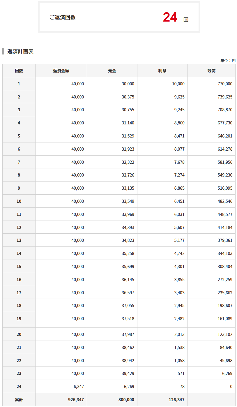 返済額を1万円上乗せすると返済回数が21回となり2年以内に完済することができるようになっています。
